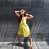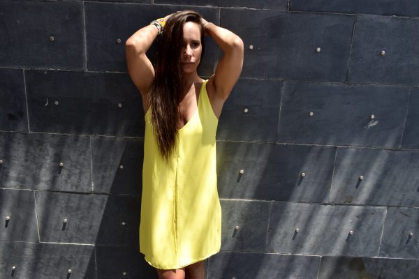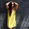 Vestido corto color amarillo-limón all over, tirantes finos y escote de pico.